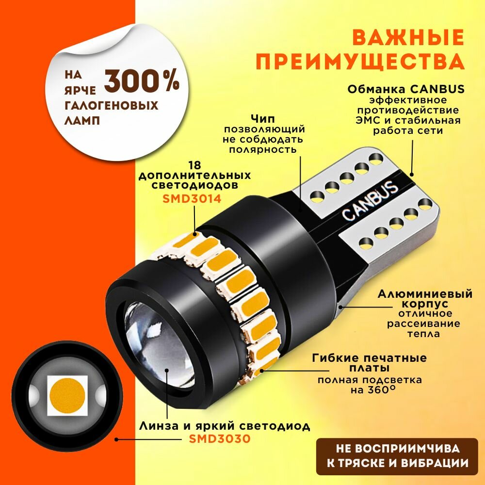 Лампы оранжевые w5w T10 cветодиодные автомобильные 12V 2 штуки с обманкой Canbus в габариты / в5в Т10 Т 10 оранжевый