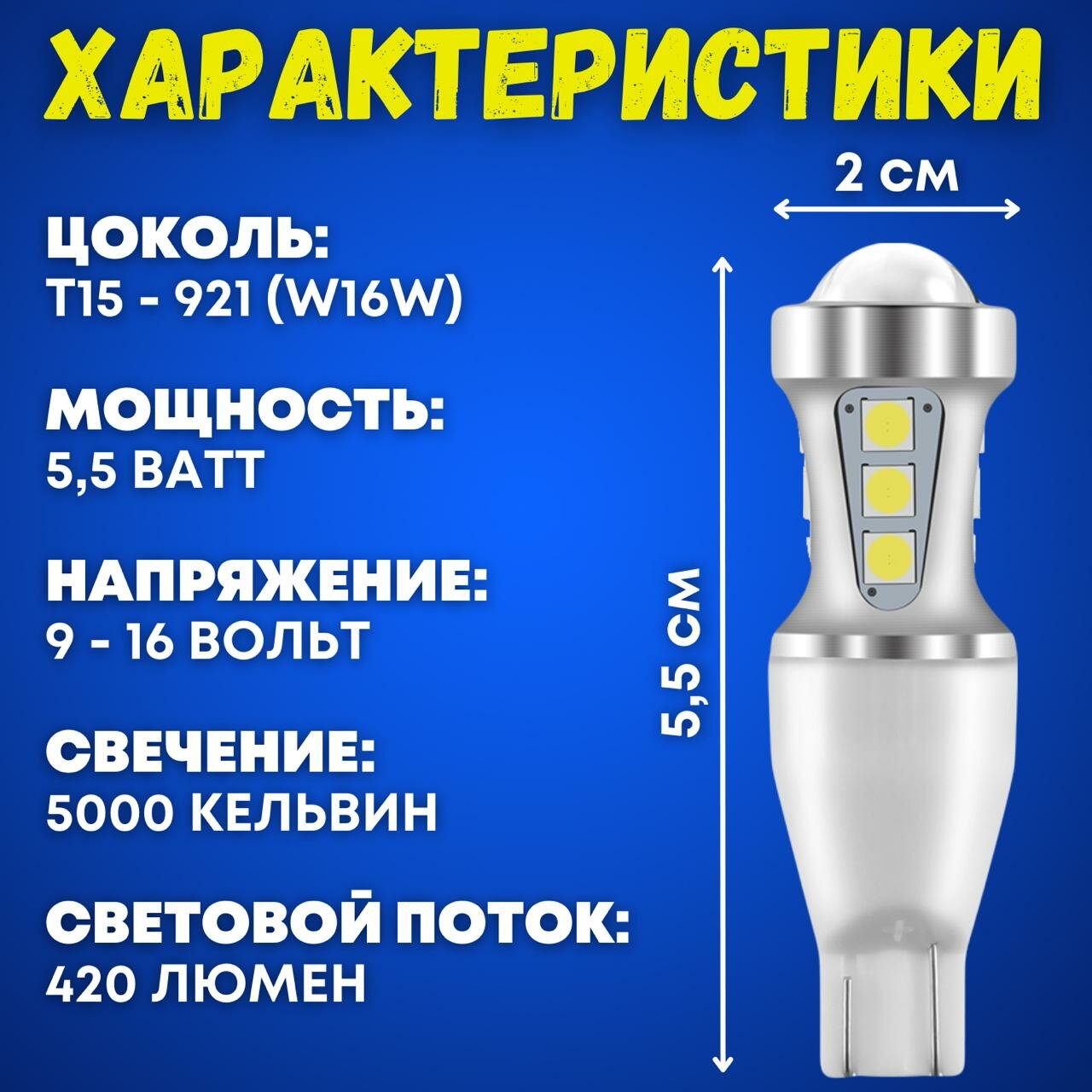 Светодиодные лампы в габариты авто T15 w16w, фонарь, автосвет, led лампы RoundLight 5000К, 2шт. информация: