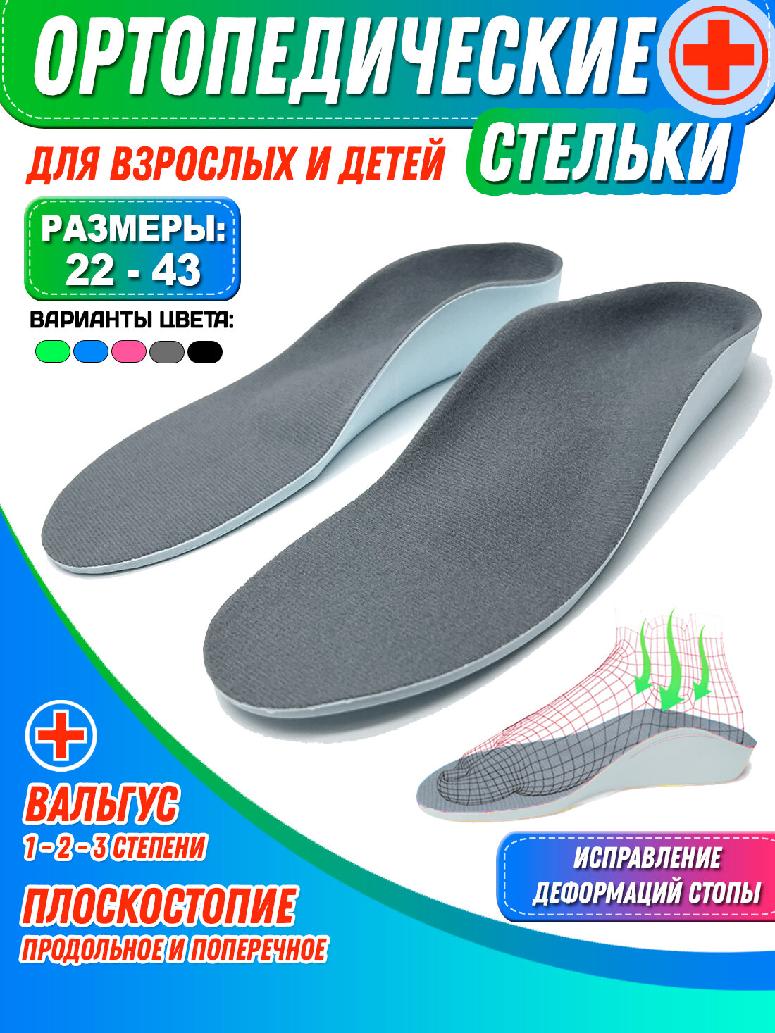 | Показания | артрит/артроз / вальгусная деформация / варусная деформация / искривление позвоночника / натоптыши / повышенная нагрузка на ноги / поперечное плоскостопие / продольно-поперечное плоскостопие / продольное плоскостопие / пяточная шпора |