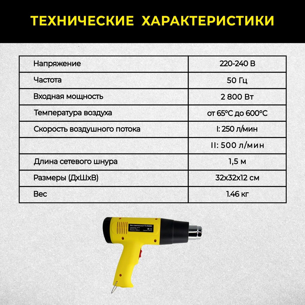 Фен строительный TECHNICOM TC-HG2800, 65-600 °С, 250-500 л/мин, 2800 Вт, 6 аксессуаров информация: