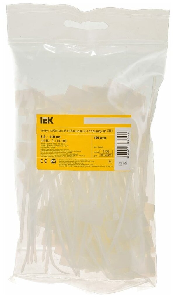 Хомут кабельный ХП1 2.5х110 нейл. бел. с таб. 20х13 (уп.100шт), IEK UHH61-3-110-100 (1 упак) информация: