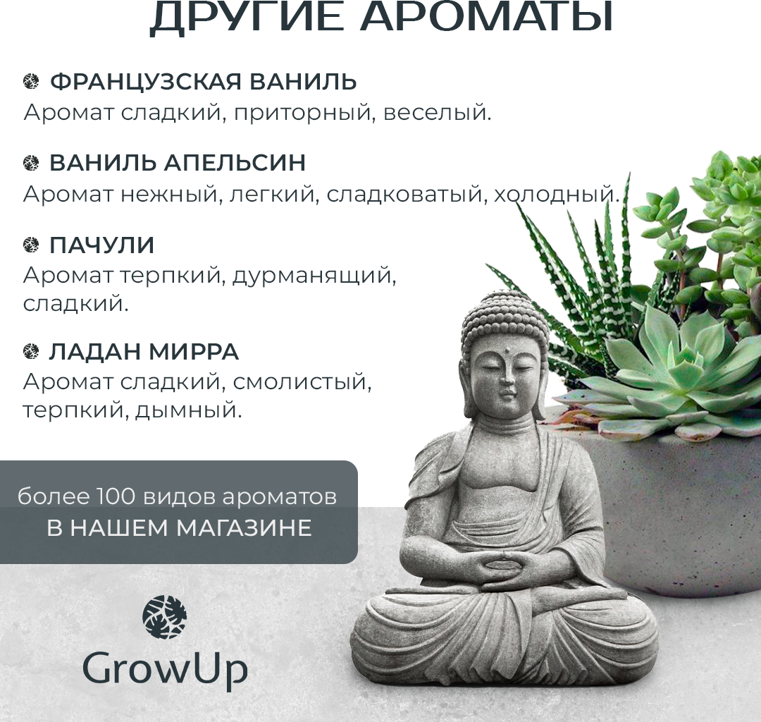 | Базовый аромат | апельсин, бергамот, ваниль, вишня, гвоздика, десертный, ель, жасмин, зеленый чай, иланг-иланг, имбирь, камфора, кедр, клубника, корица, лаванда, ладан, лайм, лемонграсс, лимон, лимонник, лотос, манго, мелисса, мирра, можжевельник, мята, пачули, пихта, природа и свежесть, роза, розмарин, ромашка, сандал, сирень, сосна, травы, фенхель, фруктовый, цветочный, цитрусовый, эвкалипт |