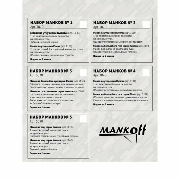 Набор Mankoff №2 манок на утку Kwanza (1110), манок на гуся Kwanza (2110) (+ подвес на 2 манка) информация: