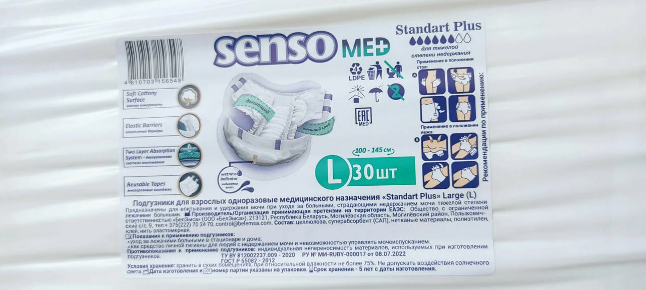 Подгузники для взрослых Senso Med, размер L, 30 штук, 6 капель (100-145 см обхват талии) информация: