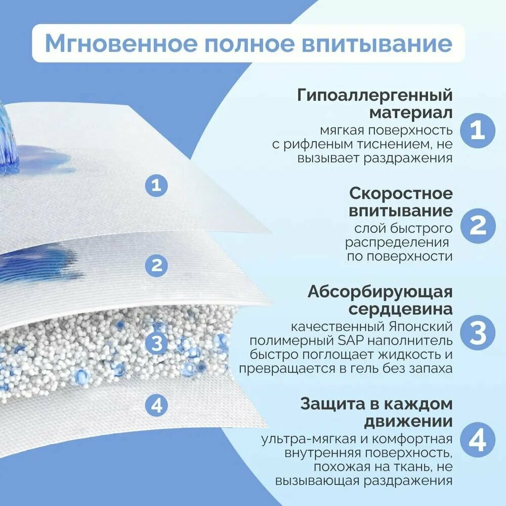 | Особенности | впитывающие / гипоаллергенные / непромокаемые / ночные / с индикатором наполнения / с нейтрализатором запаха / эластичный пояс |