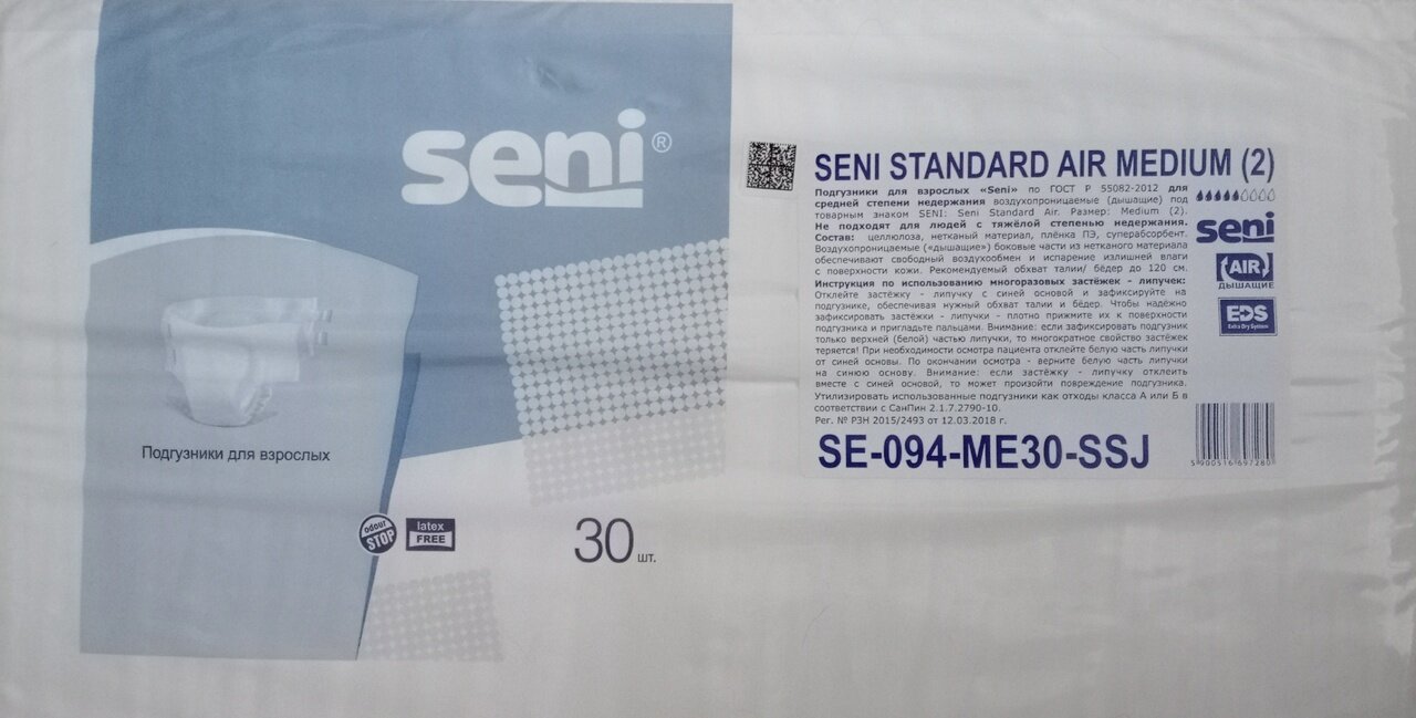 Подгузники для взрослых Seni Standard Air 5 капель, M, 5 капель, 75-110 см, 1 уп. по 30 шт. информация: