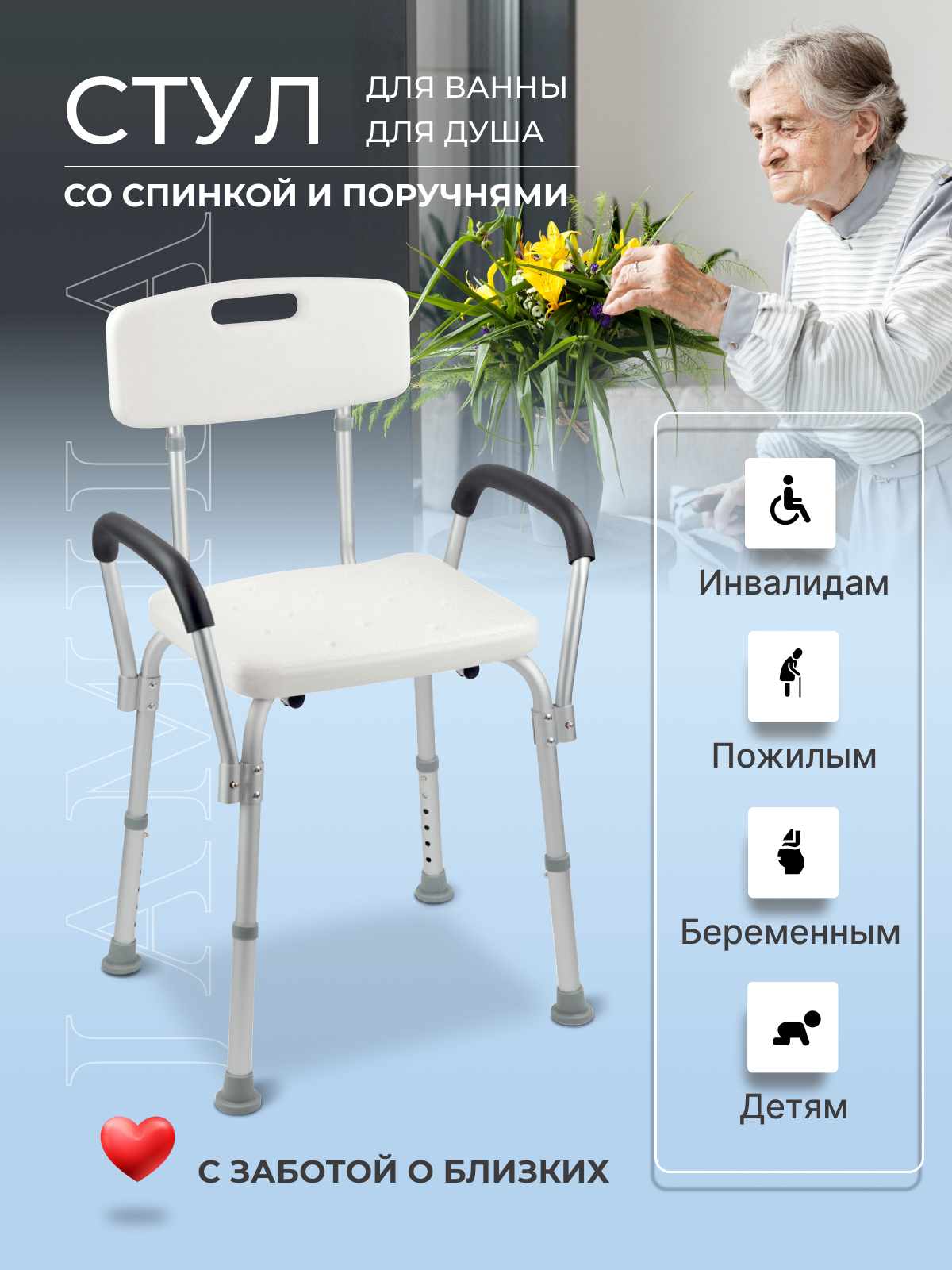 Стул для ванны и душа с подлокотниками и спинкой информация: