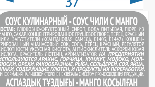 | Состав | глюкозно-фруктозный сироп, вода питьевая, пюре из манго, сахар, концентрированное грушевое пюре, перец красный чили, загустители (ксантановая камедь, Е1403, Е1442), концентрированный ананасовый сок, соль, перец красный, регулятор кислотности уксусная кислота, антиокислитель аскорбиновая кислота, краситель лютеин, ароматизатор |