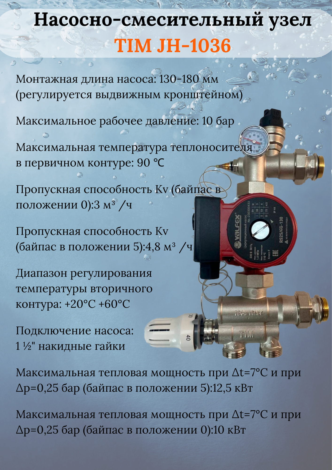 | Подробная комплектация | 1.Коллекторная группа из нержавеющей стали в сборе с расходомерами 2.Насосно-смесительного узел для теплого пола TIM JH-1036 предназначен для приготовления теплоносителя в системах водяных теплых полов с температурой от 20 до 60 °С. 3.Комплекта Евро-конусов 3/4х16х2,0 для подключения полимерных труб. 4.Циркуляционный насос TIM, VIEIR или VALFEX 25-6-134 |