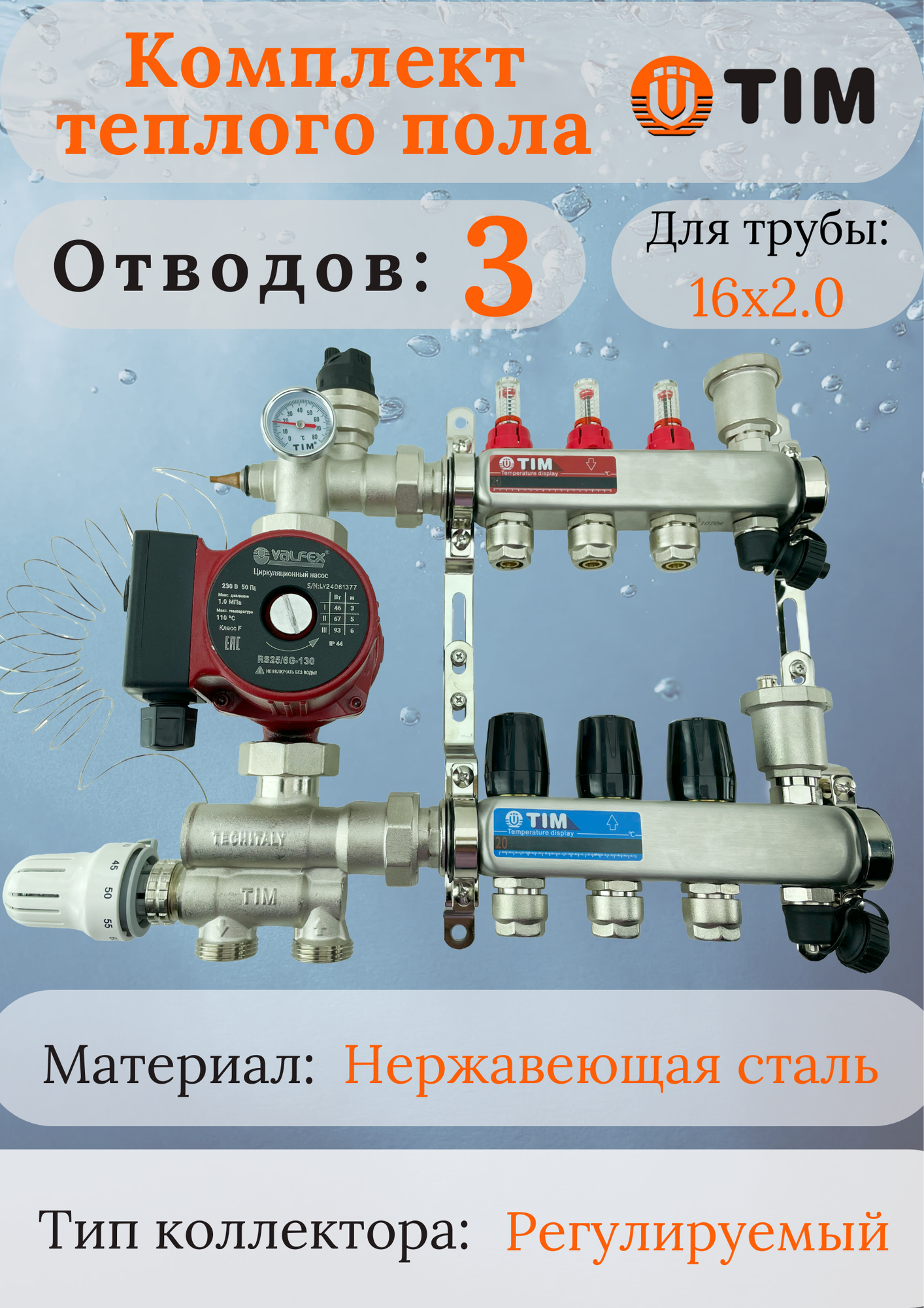 Отзывы на Комплект для водяного теплого пола : Коллектор 3 выхода с расходомерами 1" - 3/4" + узел JH-1036 + насос 25-60 130 + евроконус - TIM (до 60 кв. м.)