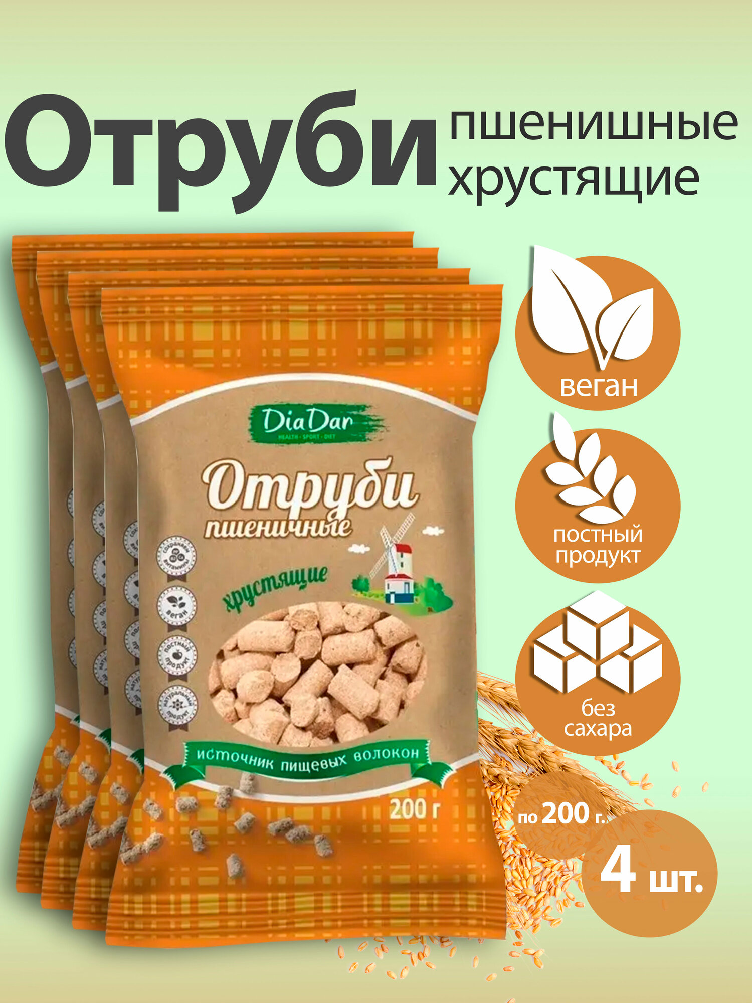 Отруби "диадар" Пшеничные 4 шт по 200 гр без сахара / веган/ пост / без лактозы информация: