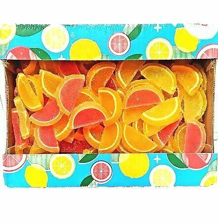 | Состав | сахар, патока, вода питьевая, агент желирующий агар, белок яичный сухой, регулятор кислотности лимонная кислота, красители (куркумин, кератины, экстракт паприки, ароматизаторы "Апельсин", " Лимонное масло", "Грейпфрут") Продукт может содержать диоксид серы |