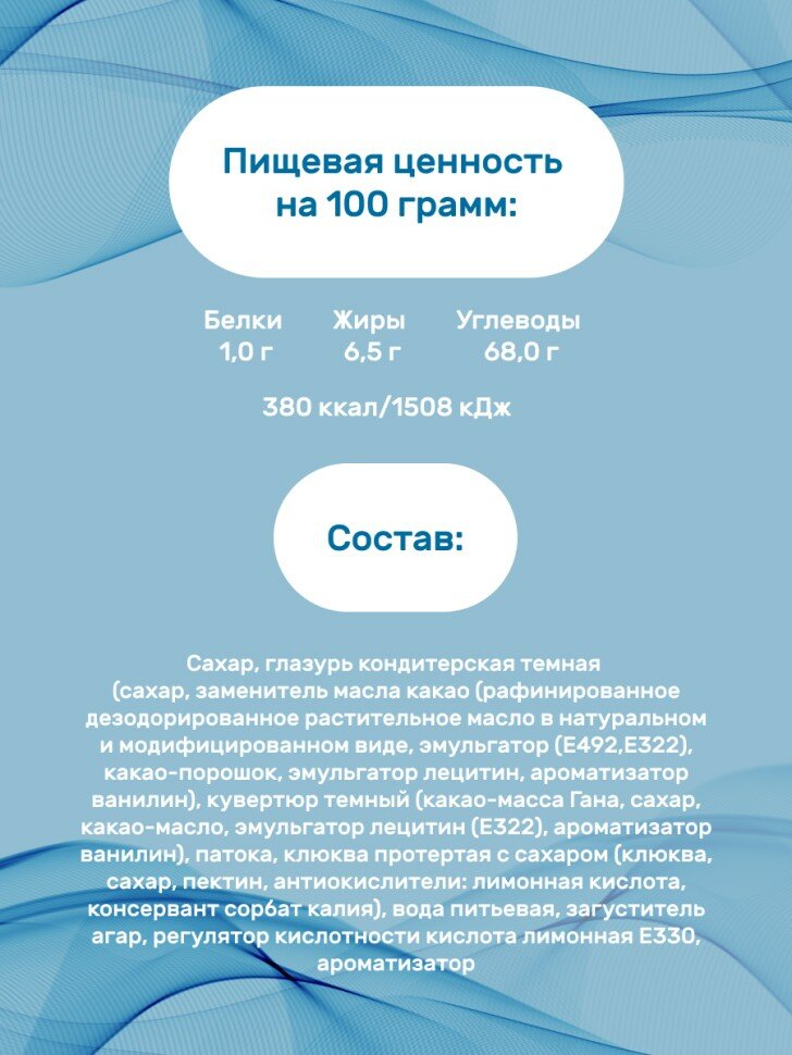 | Состав | сахар, патока, морошка, вода питьевая, загуститель агар Е406, регулятор кислотности: кислота лимонная, кислота молочная |