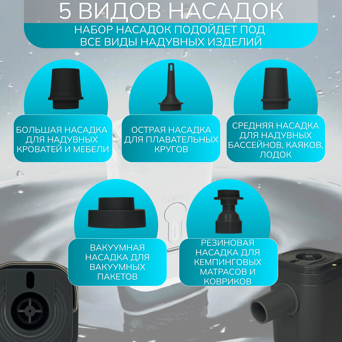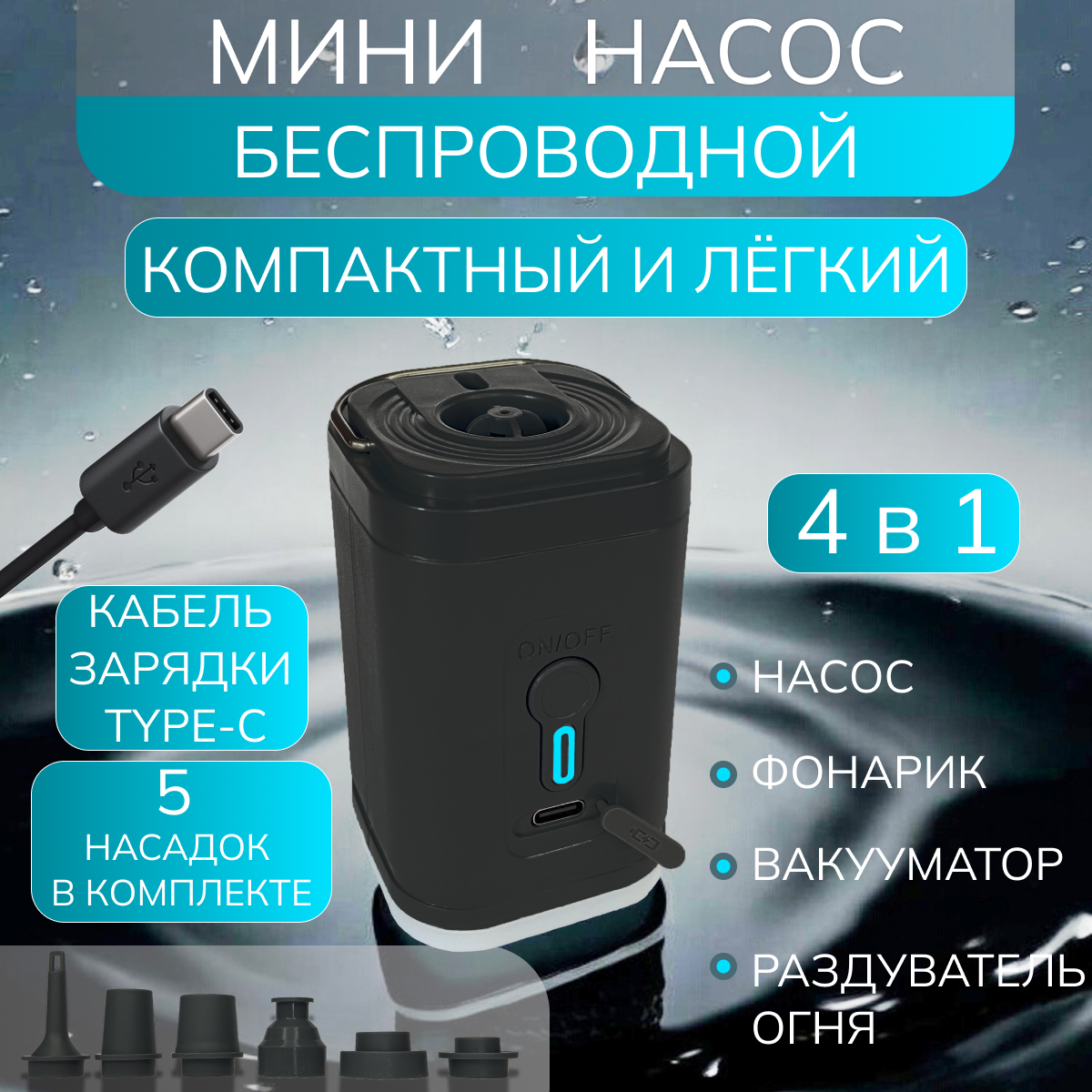 Насос электрический портативный беспроводной для круга и надувного матраса, 4 в 1 информация: