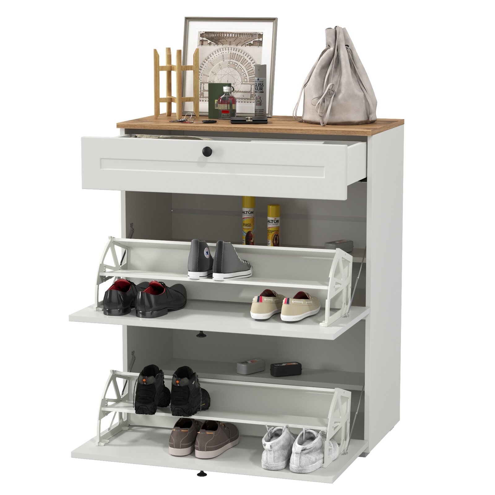 | Комплектация | с выдвижным ящиком для мелочей сверху и двумя откидными дверками с полками для обуви снизу; каждая откидная дверь расчитана для хранения и размещения 6 пар невысокой обуви; скрытые направляющие выдвижных ящиков; двери оснащены четырехшарнирными петлями без доводчиков; регулируемые опоры; лицевая фурнитура в виде черных аккуратных ручек на фасадах |