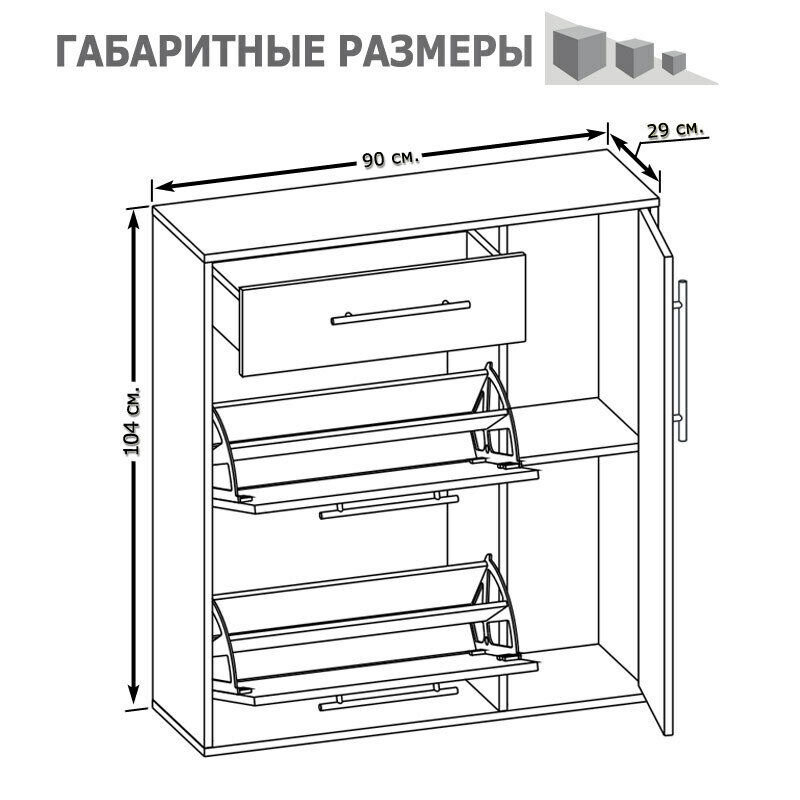 | Комплектация | 1 полка, 1 ящик, 2 полки для обуви, 3 дверцы |