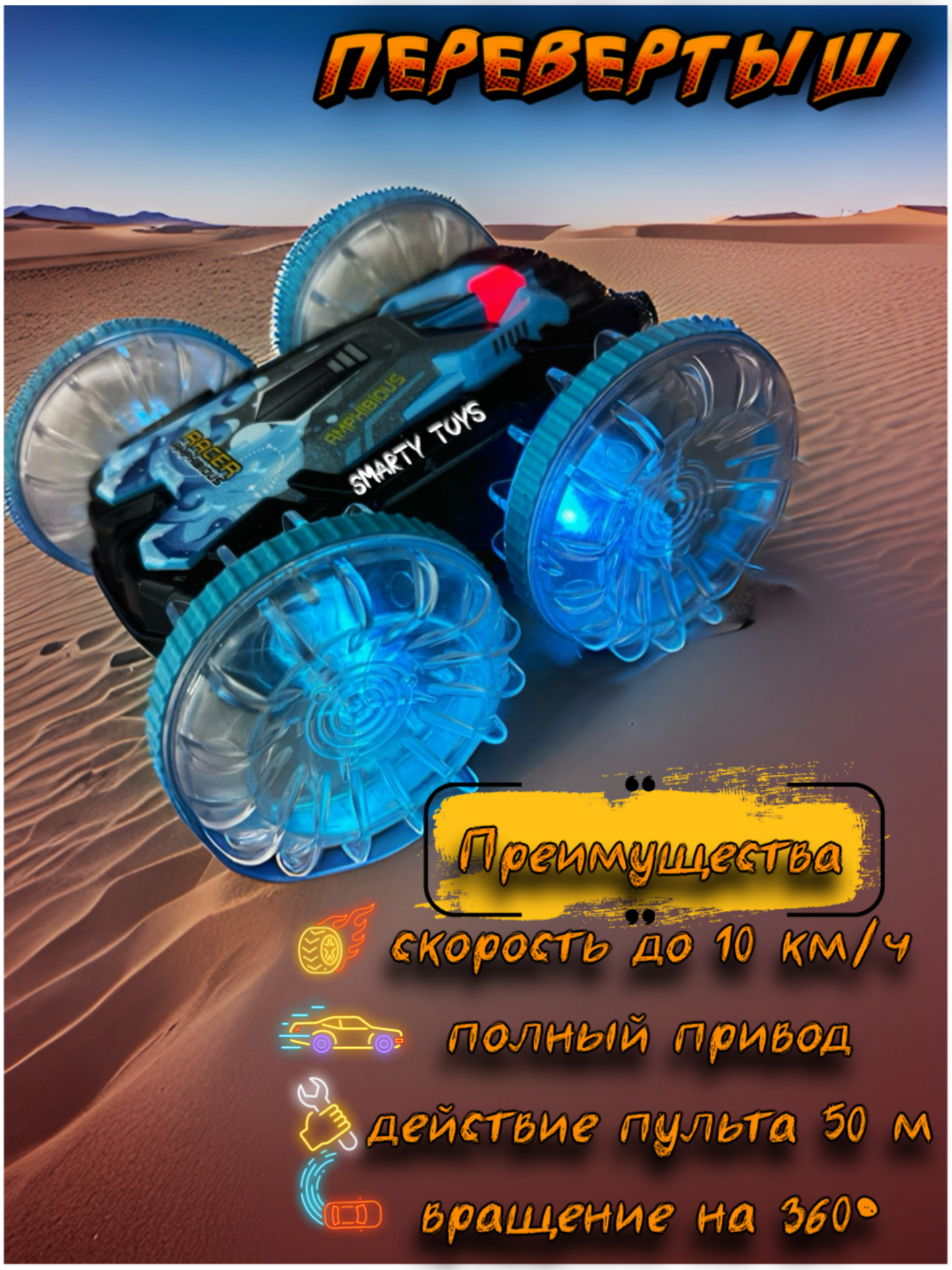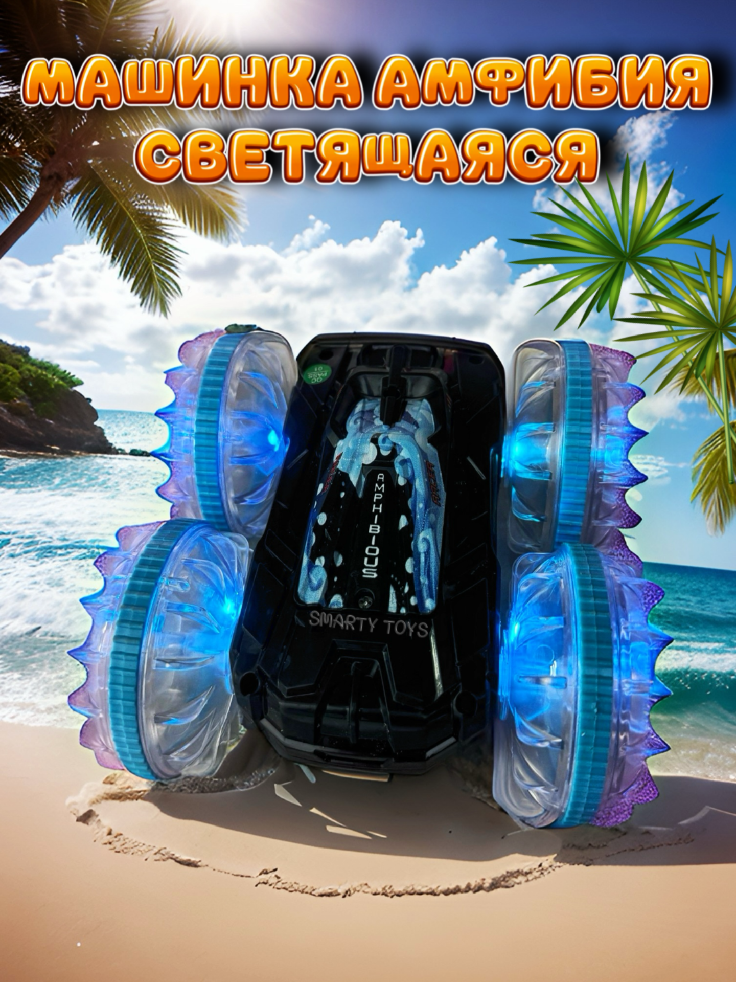 Отзывы на Машинка амфибия на радиоуправлении светящаяся, машина на пульте управления перевертыш с аккумулятором Car Amphibiou, полный привод, Синия-Цветная