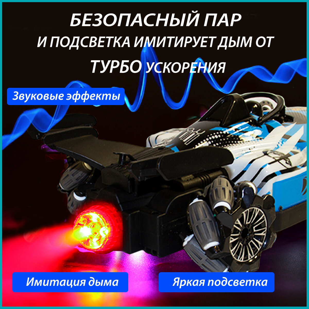 Радиоуправляемая гоночная машинка. С подсветкой "дыма". Управление жестами, голубая 3 990 ₽