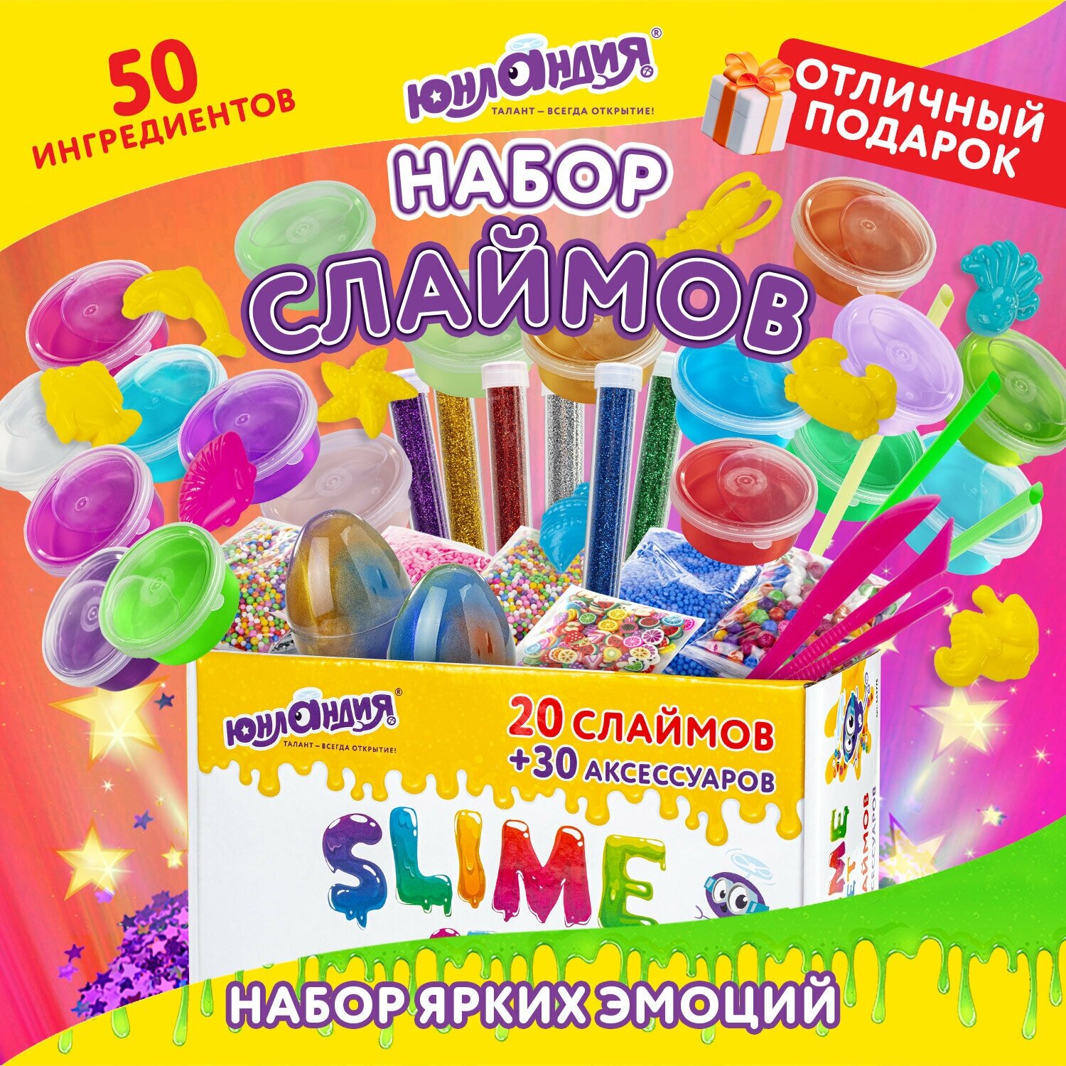 Набор слаймов 20 цветов. 30 аксессуаров. в пластиковом боксе. Юнландия. 663775 информация: