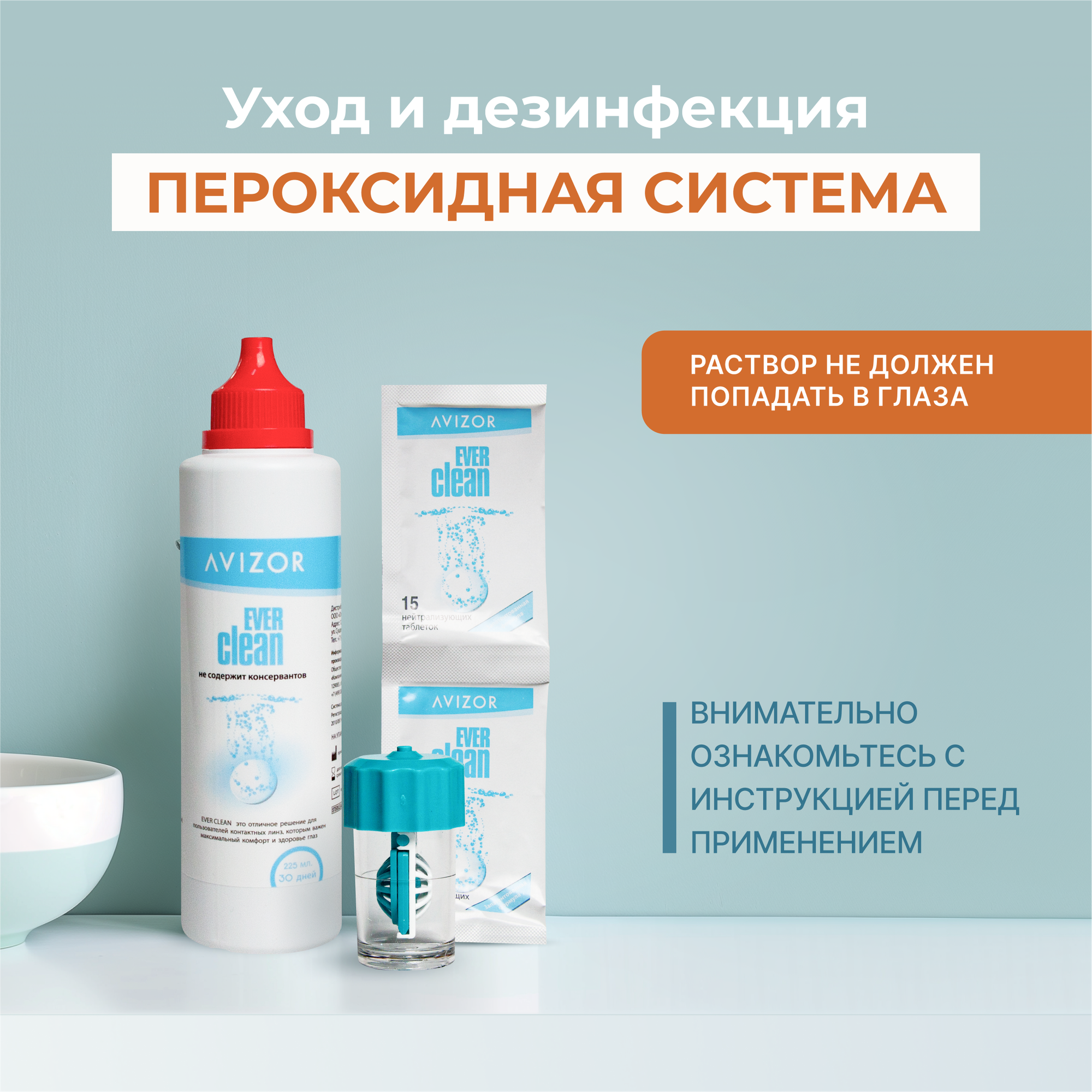 Пероксидная система Avizor, раствор для контактных линз Ever Clean, 225 мл + 30 таблеток с контейнером