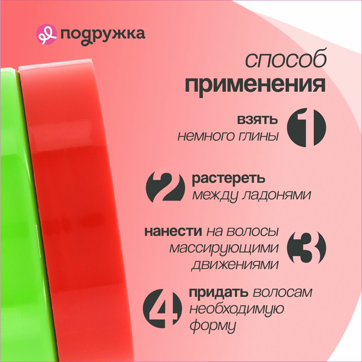 | Способ применения | Разотрите небольшое количество глины между ладонями, равномерно нанесите на волосы легкими массирующими движениями, придайте прическе необходимую форму. При необходимости воспользуйтесь феном. |