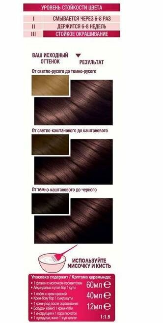 | Способ применения | мешайте крем-краску и молочко-проявитель. Нанесите на волосы. Подождите рекомендованное на упаковке время и смойте. Нанесите бальзам. Смойте. Для усиления защиты цвета от вымывания используйте шампунь для окрашенных волос |