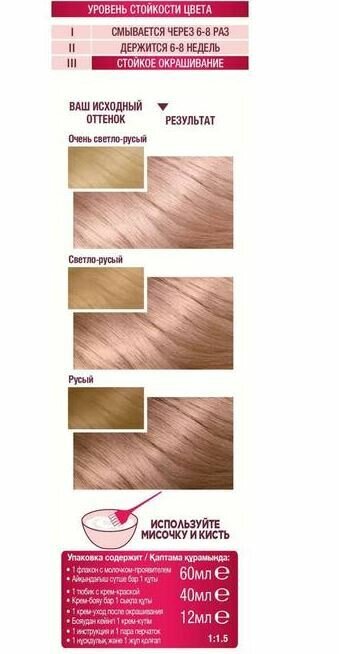 | Способ применения | мешайте крем-краску и молочко-проявитель. Нанесите на волосы. Подождите рекомендованное на упаковке время и смойте. Нанесите бальзам. Смойте. Для усиления защиты цвета от вымывания используйте шампунь для окрашенных волос |