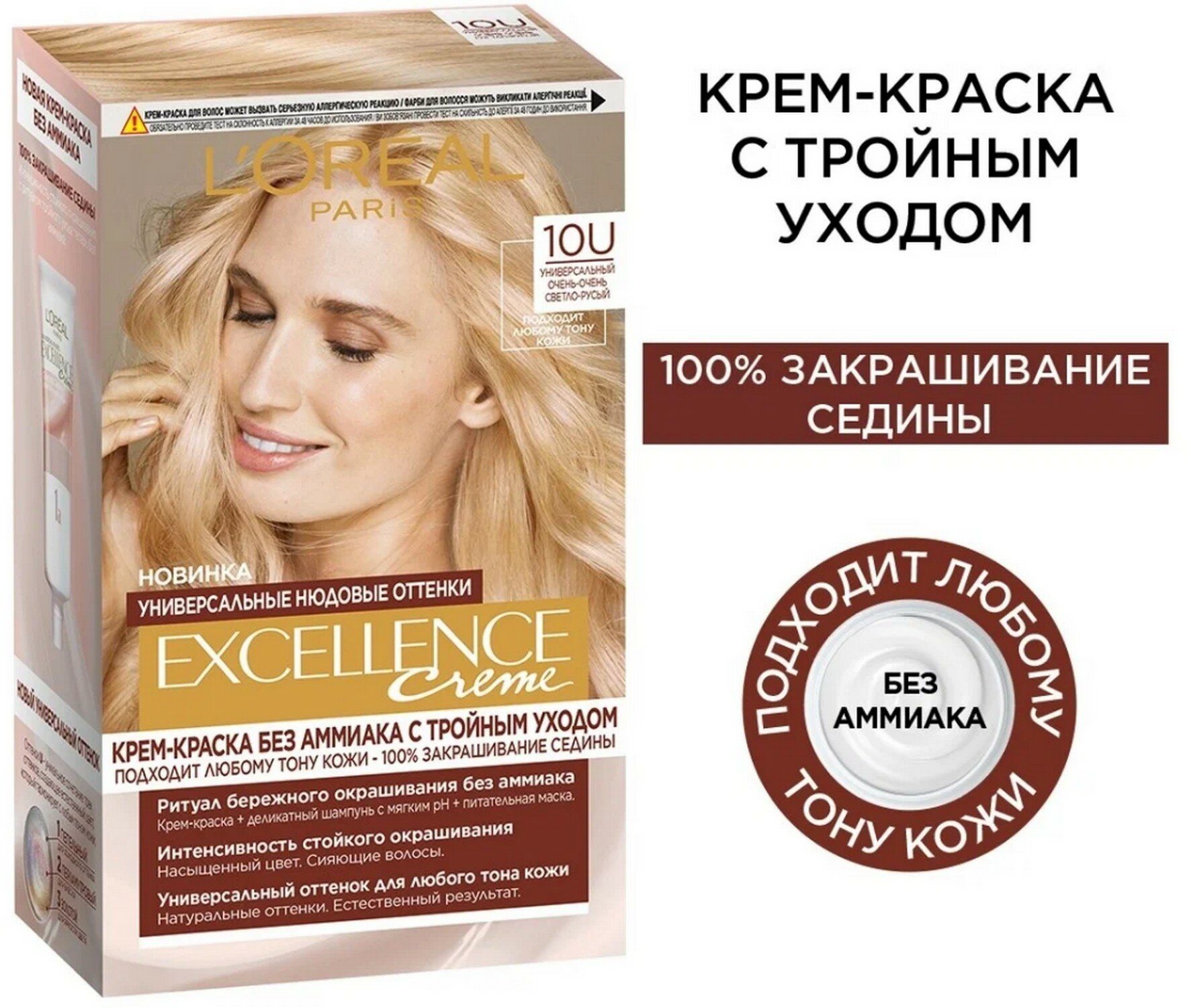 L'Oreal Paris крем-краска для волос без аммиака "Excellence Crème Универсальные Нюдовые Оттенки", оттенок 10U, универсальный очень-очень светло-русый