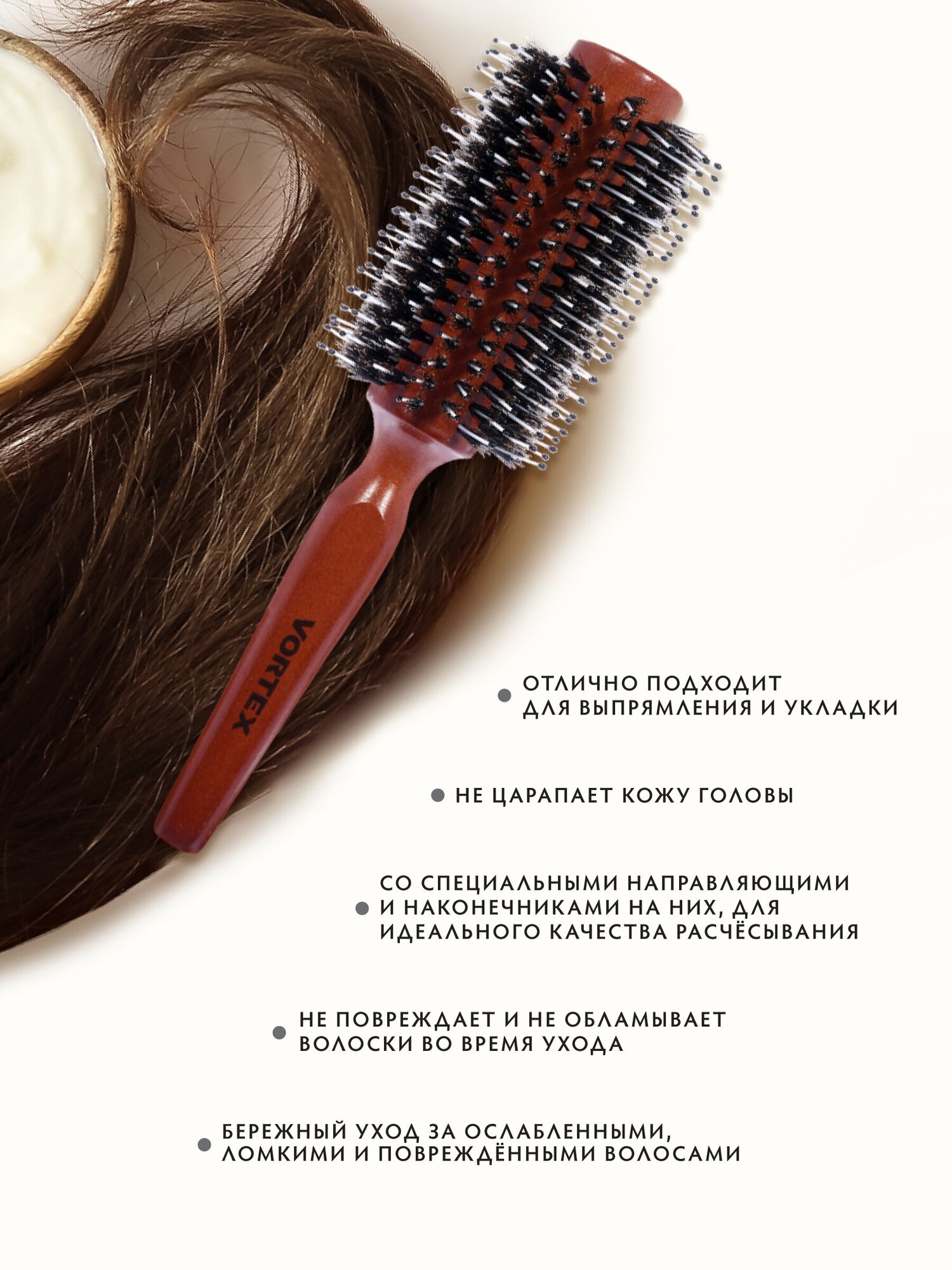 Отзывы на Расческа деревянная, брашинг /для волос/с ручкой/для укладки D-7,5х23 см, с пластиковыми зубчиками и натуральной щетиной "VORTEX"