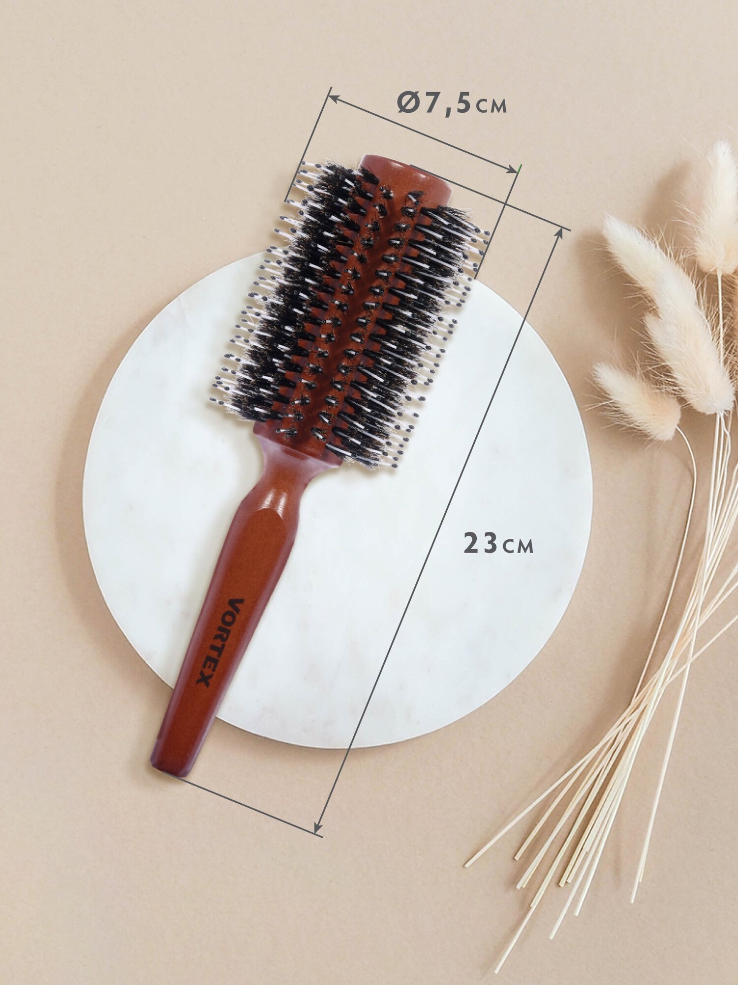 Расческа деревянная, брашинг /для волос/с ручкой/для укладки D-7,5х23 см, с пластиковыми зубчиками и натуральной щетиной "VORTEX" информация: