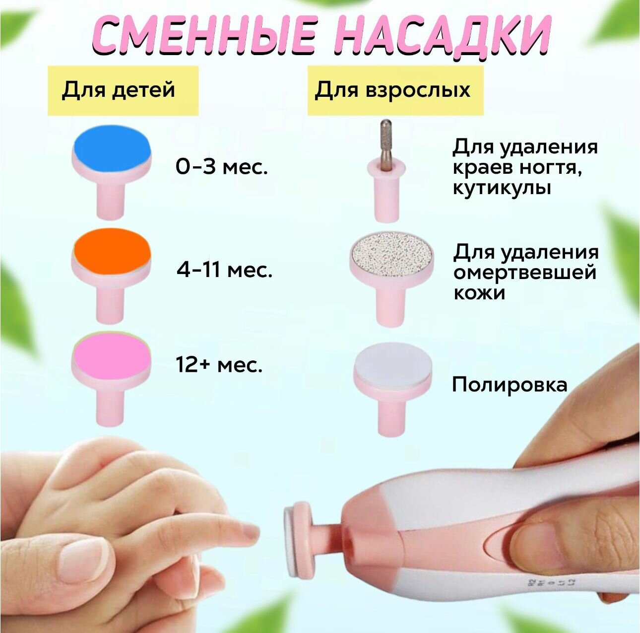 Детский триммер для ногтей, безопасная электрическая пилка для детей, набор для ногтей с 6 насадками и подсветкой информация: