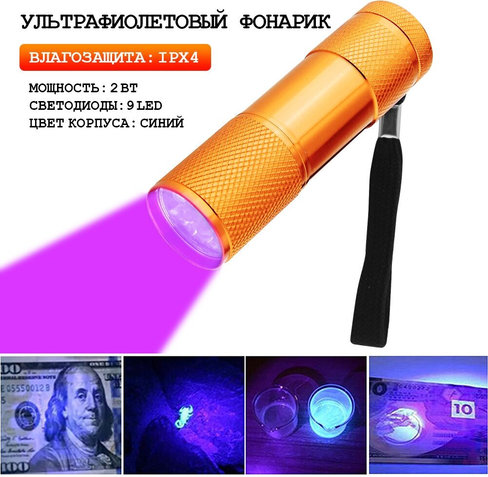 Ультрафиолетовый фонарик 395nm 9LED для обнаружения органики и сушки лака и клея (оранжевый) информация: