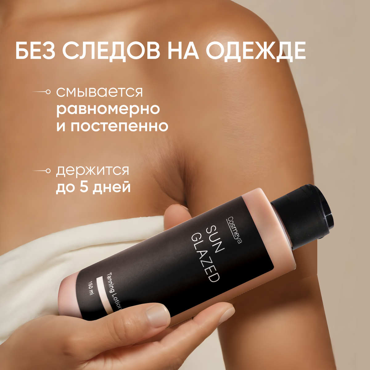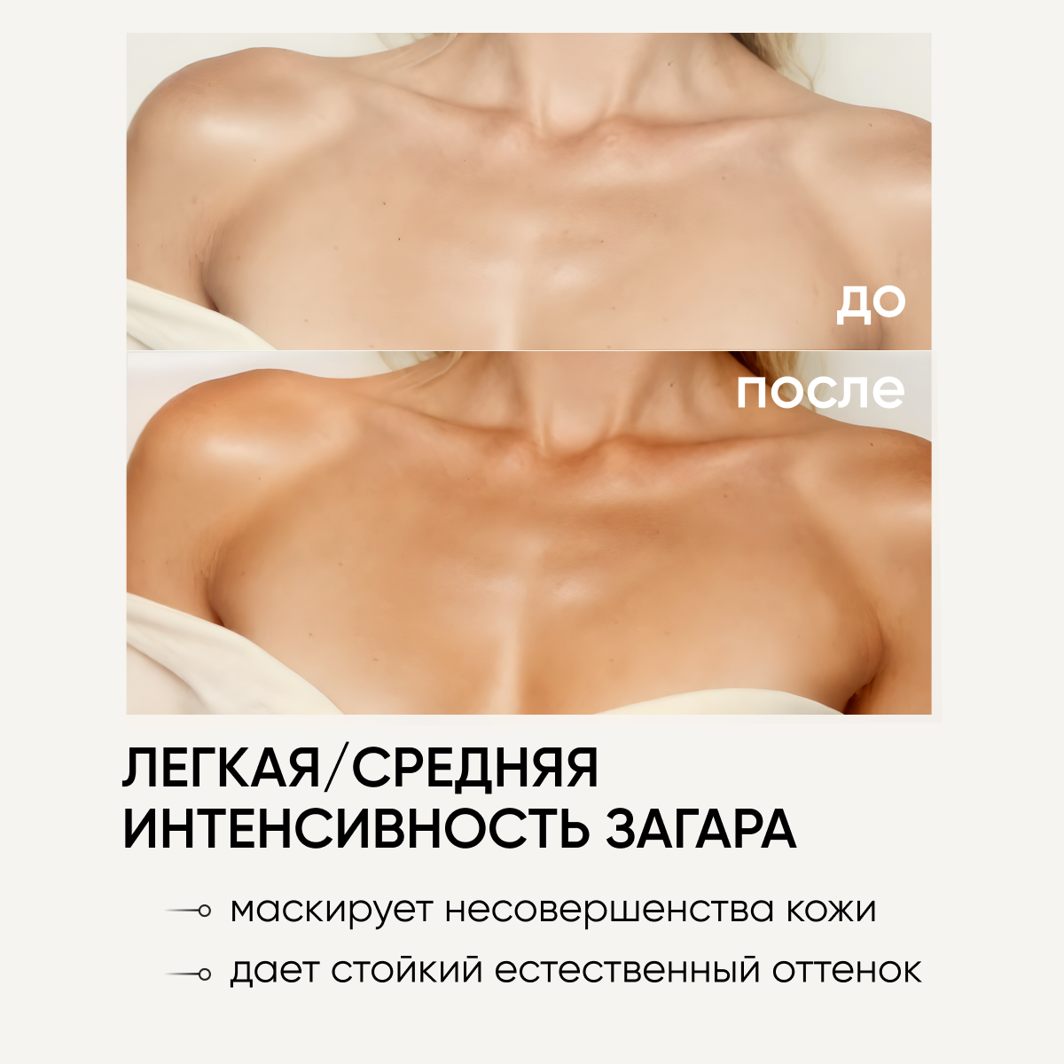| Способ применения | За 1 день до: проскрабируй кожу. Перед нанесением: не используй кремы или бальзамы после вечернего душа. Нанесение: распредели лосьон руками в 1 слой. Смывать не надо. На локти и колени используй меньше средства, потому что они окрашиваются сильнее. Тщательно вымой руки. Дождись полного впитывания перед одеванием. Важно! Старайся наносить лосьон в один слой, особенно при первом применении. Загар будет проявляться постепенно от 2 до 5 часов, в зависимости от типа кожи. |