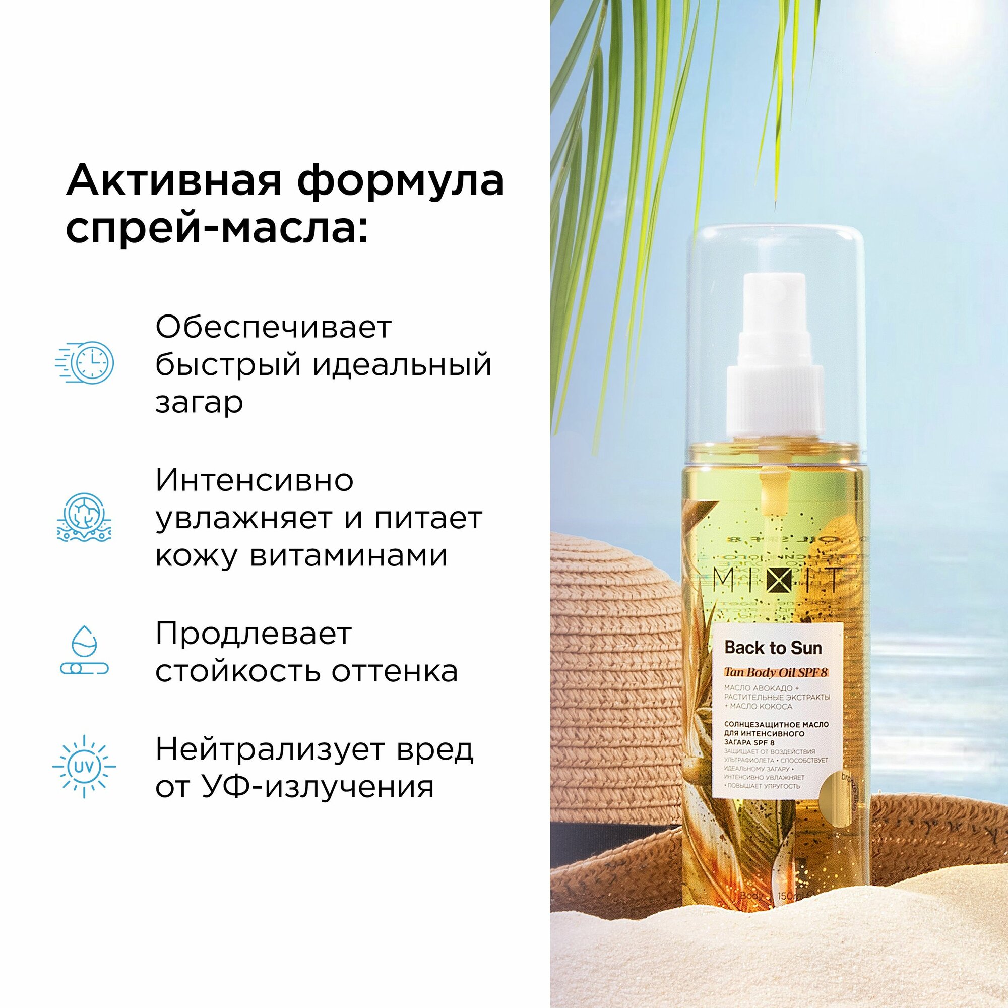 Масло спрей для тела MIXIT "BACK TO SUN" солнцезащитное для интенсивного загара SPF 8, с кокосовым маслом и миндалем, 150 мл информация: