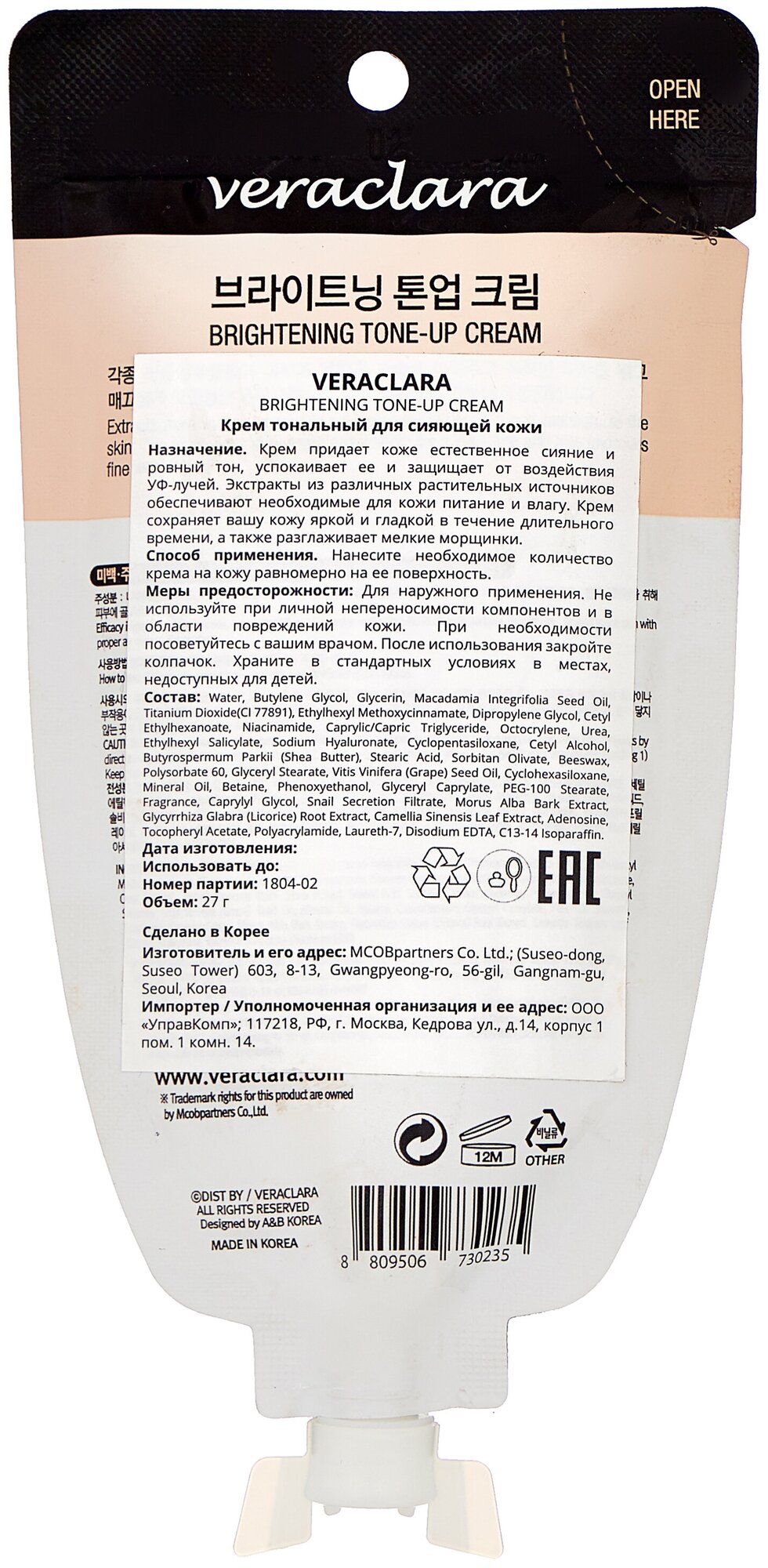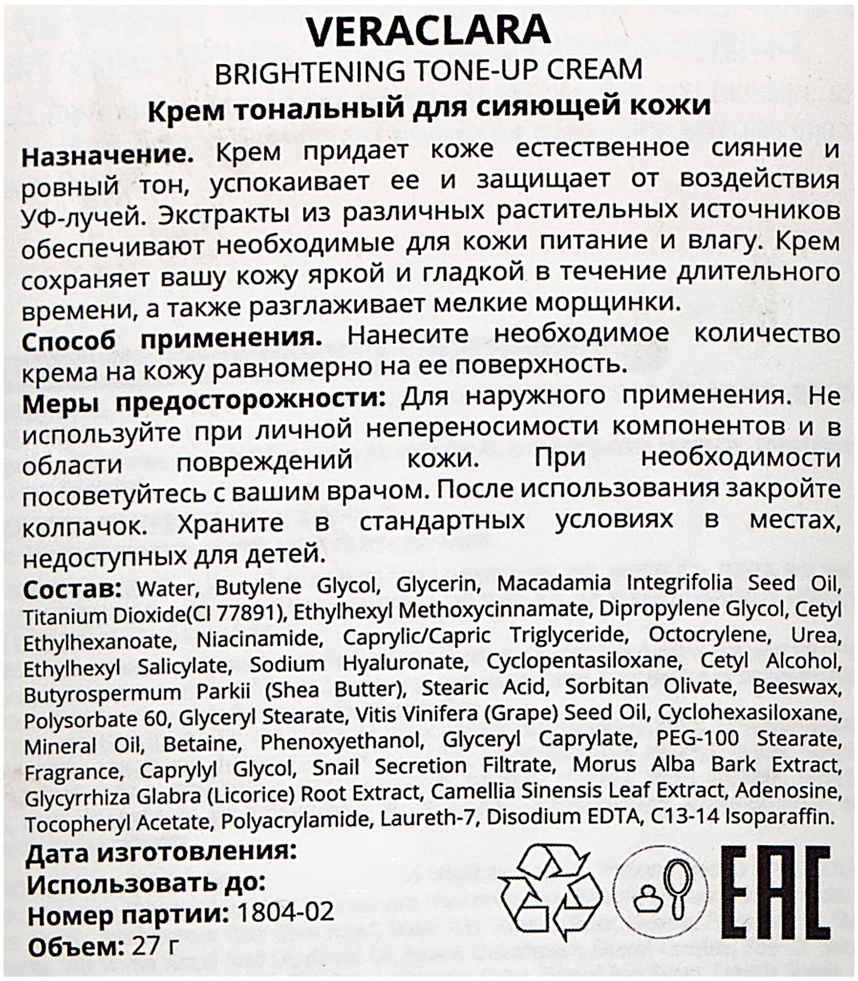 Veraclara Крем для лица осветляющий и тонизирующий – Brightening tone-up cream, 27г информация: