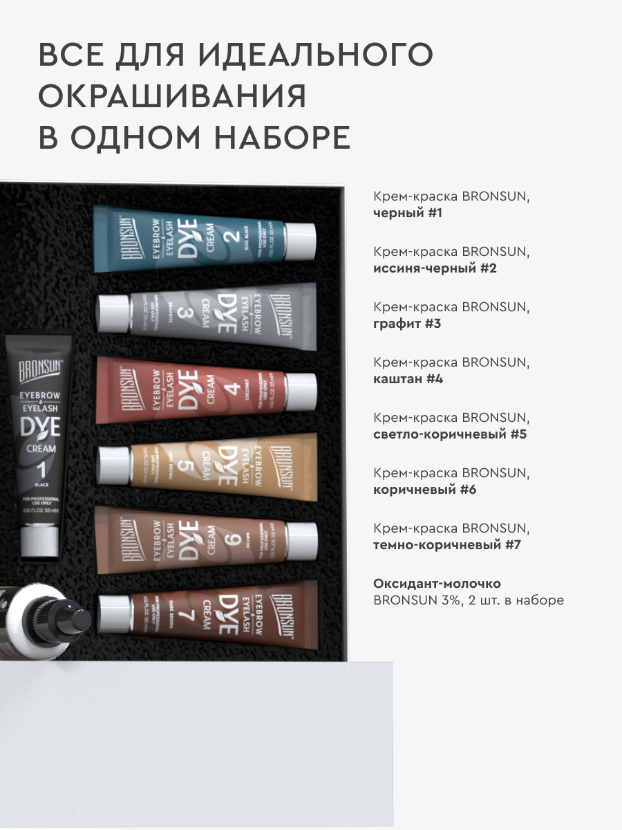 | Комплектация | Крем-краска для бровей и ресниц BRONSUN, цвет черный #1, 15 мл — 1 шт.; Крем-краска для бровей и ресниц BRONSUN, цвет иссиня-черный #2, 15 мл — 1 шт.; Крем-краска для бровей и ресниц BRONSUN, цвет графит #3, 15 мл — 1 шт.; Крем-краска для бровей и ресниц BRONSUN, цвет каштан #4, 15 мл — 1 шт.; Крем-краска для бровей и ресниц BRONSUN, цвет светло-коричневый #5, 15 мл — 1 шт.; Крем-краска для бровей и ресниц BRONSUN, цвет коричневый #6, 15 мл — 1 шт.; Крем-краска для бровей и ресниц BRONSUN, цвет темно-коричневый #7, 15 мл — 1 шт.; Оксидант-молочко BRONSUN 3%, 20 мл — 2 шт. Инструкция — 1 шт. |