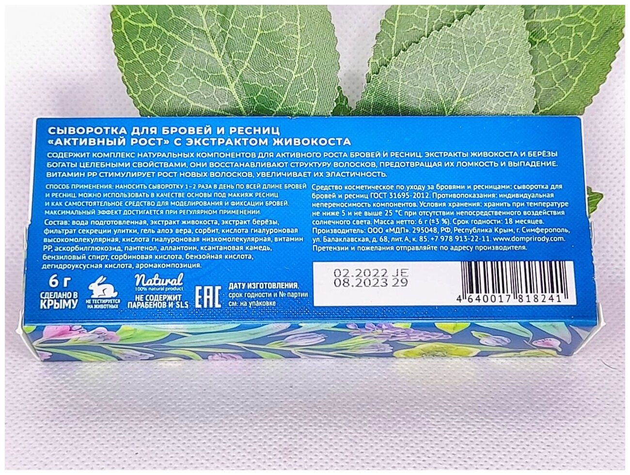 Сыворотка для бровей и ресниц "Активный рост" с экстрактом живокоста, Дом природы информация: