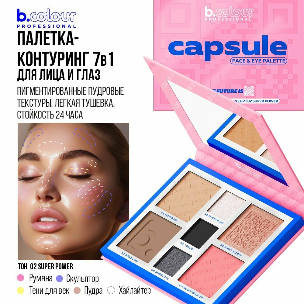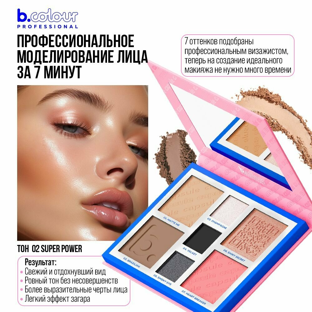 Румяна для лица, хайлайтер, пудра, тени для век, скульптор – палетка для контуринга B.COLOUR PROFESSIONAL CAPSULE 02 Super power 7в1 информация: