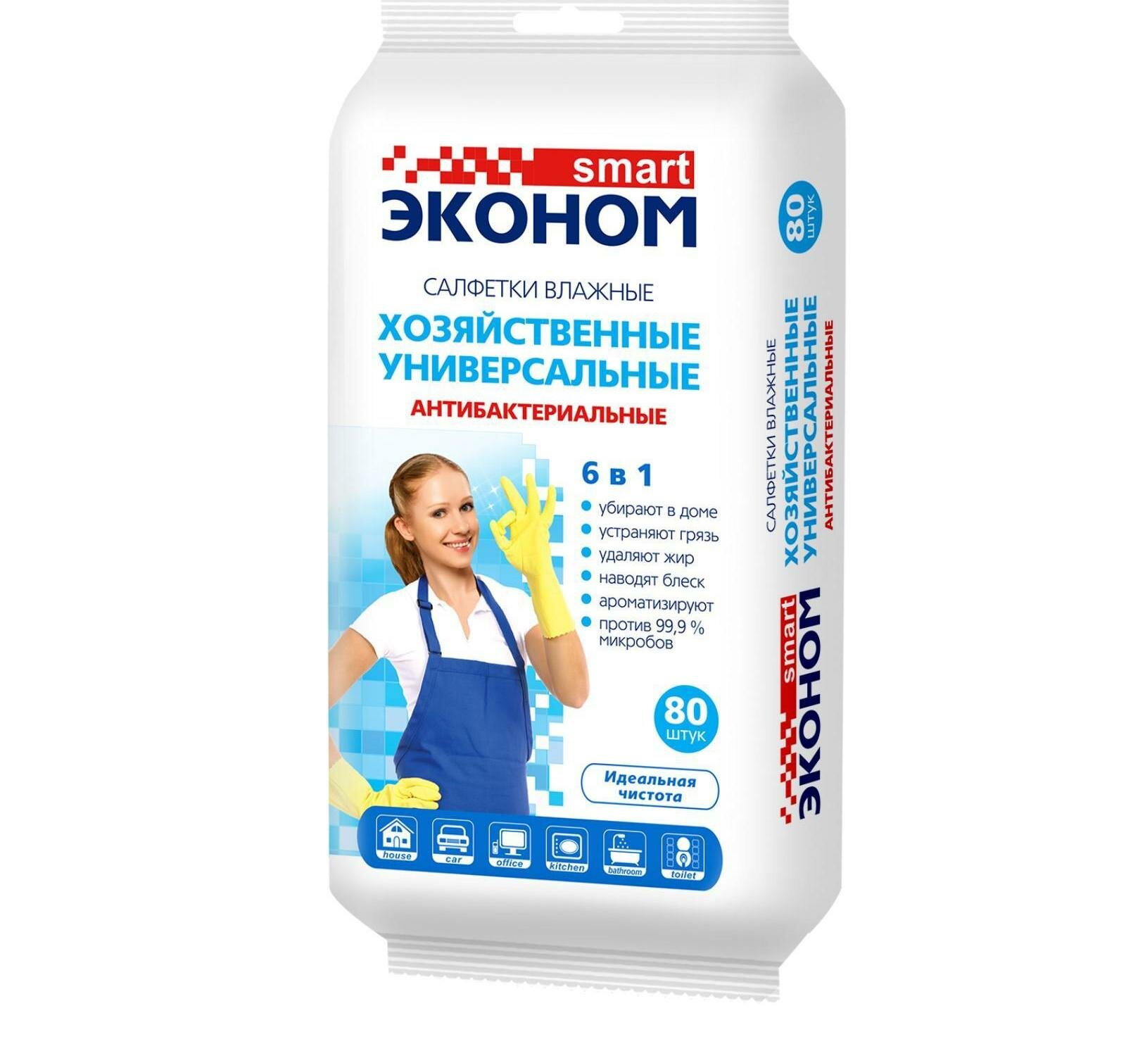 Отзывы на Влажные салфетки «Эконом Smart», универсальные, антибактериальные, 6 в 1, 80 шт.
