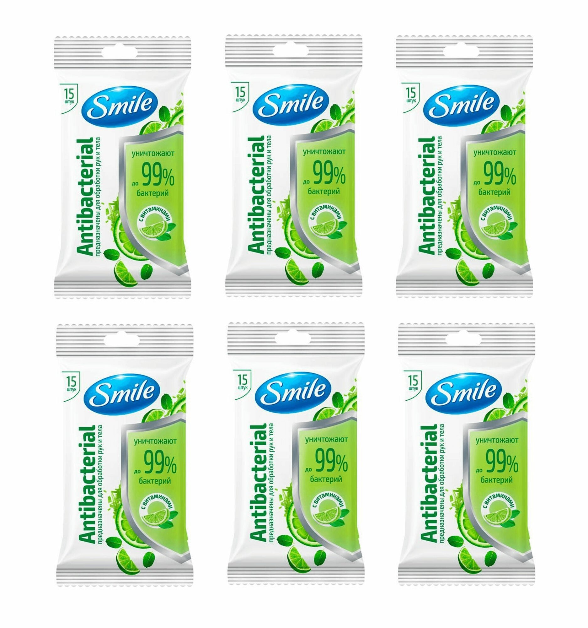 Smile Салфетки влажные Антибактериальные Лайм-мята, 15 шт, 6 штук информация: