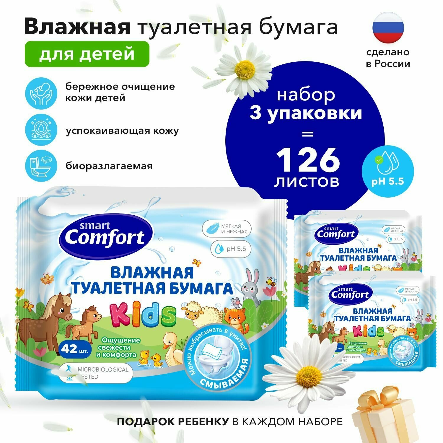 Smart Comfort Kids влажная туалетная бумага для детей набор 3 упаковки + подарок, смываемая туалетная бумага информация: