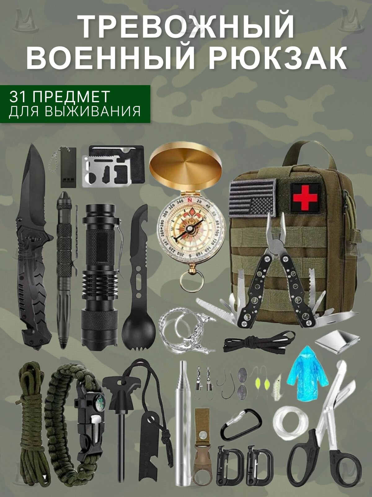 Тревожный тактический военный рюкзак для выживания 31 предмет / Комплект мультитул, спортивный походный туристический мужской набор для туризма и походов информация: