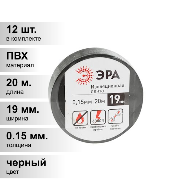 (12 шт.) Изолента ПВХ черная 19мм 20м ЭРА информация: