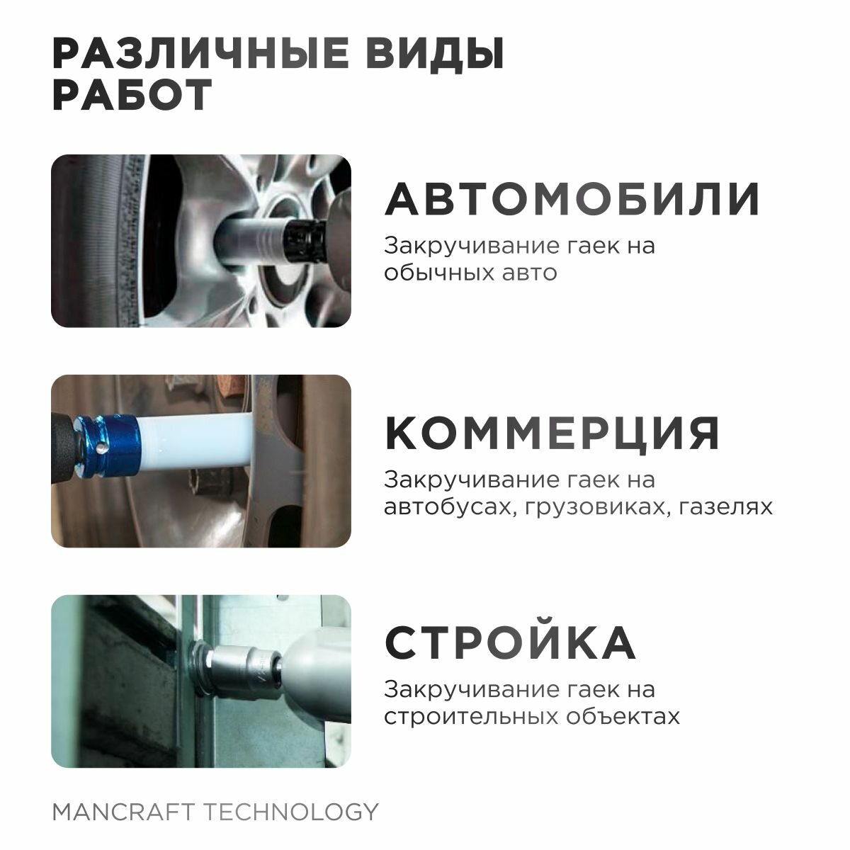 Отзывы на Гайковёрт аккумуляторный ударный MANCRAFT бесщёточный 24В, 2900 об/мин, 400 Hm