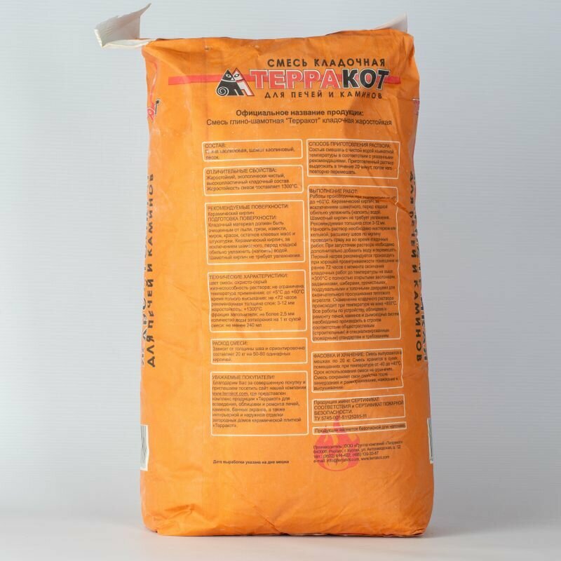Смесь кладочная глино-шамотная жаростойкая 1300 градусов, экологически чистая для печей, каминов, мангалов, барбекю, дымоходов 20кг Терракот информация: