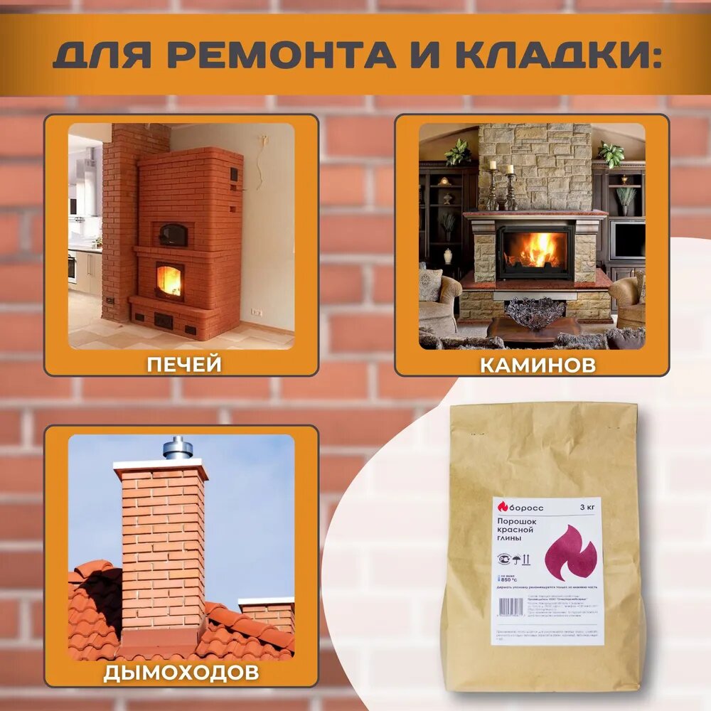 10 цен на Порошок красной глины боросс для изготовления огнеупорных масс, смесей, ремонта и кладки печей, каминов, дымоходов и теплоизоляции 3 кг,Огнеупорность 850 градусов С