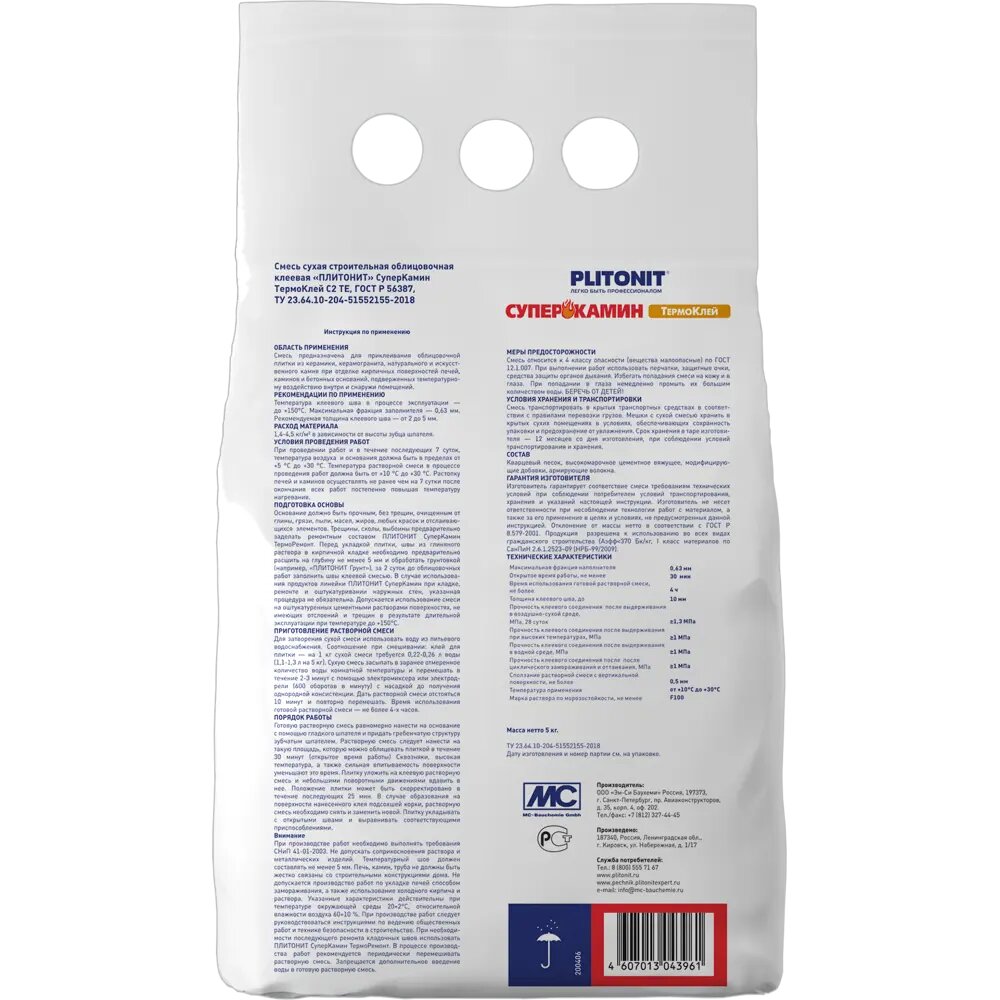 Клей термостойкий Плитонит СуперКамин ТермоКлей 5 кг информация:
