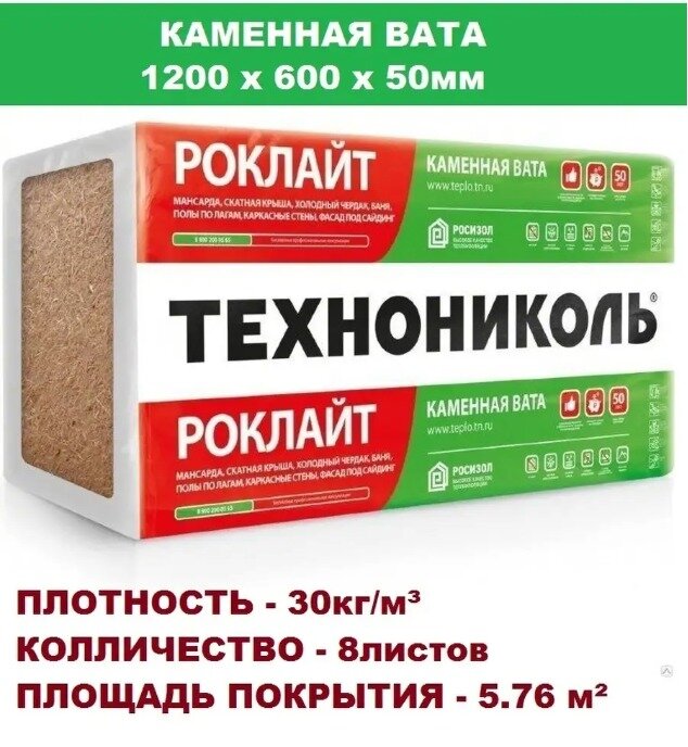 Каменная вата Роклайт, размер 1200х600х50мм, плотность 30кг/м3, 5,76м2 информация: