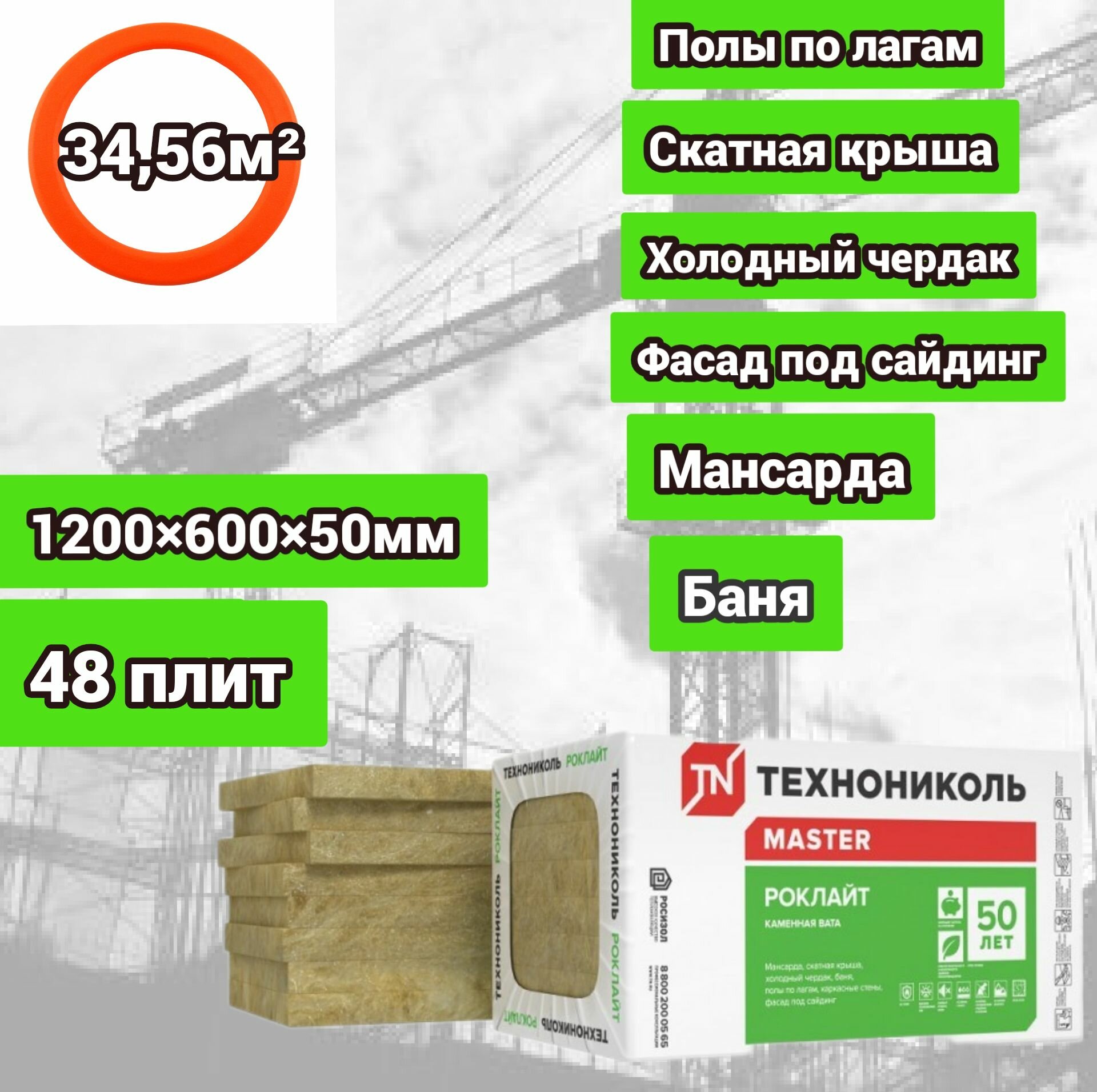 Утеплитель каменная вата(базальт) Технониколь Роклайт 1200х600х50мм (48 плит /34.56 м2) информация: