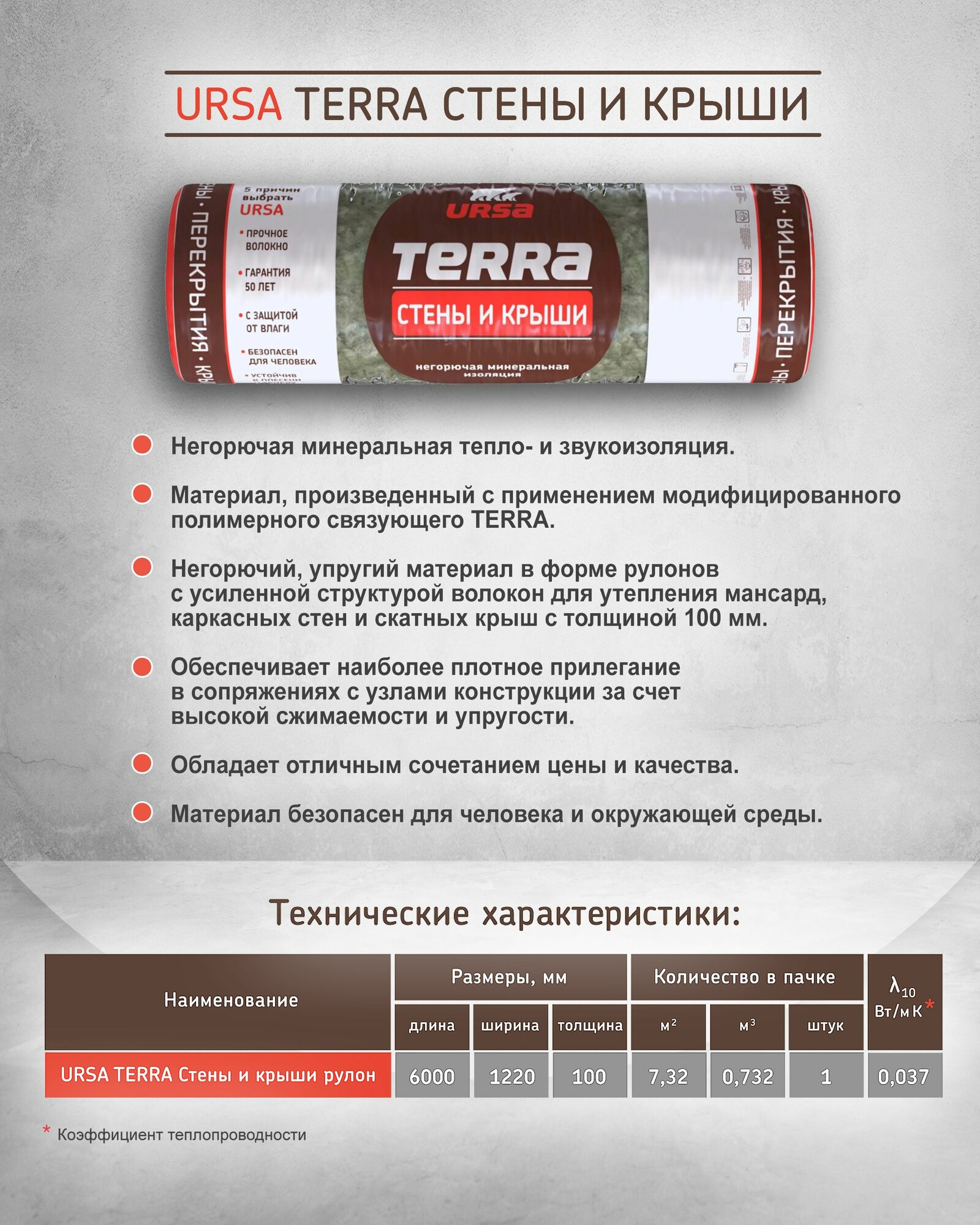 Утеплитель рулонный URSA Terra Стены и крыши 5 рулонов, 36.6 м2 для утепления мансард, стен, скатных крыш информация: